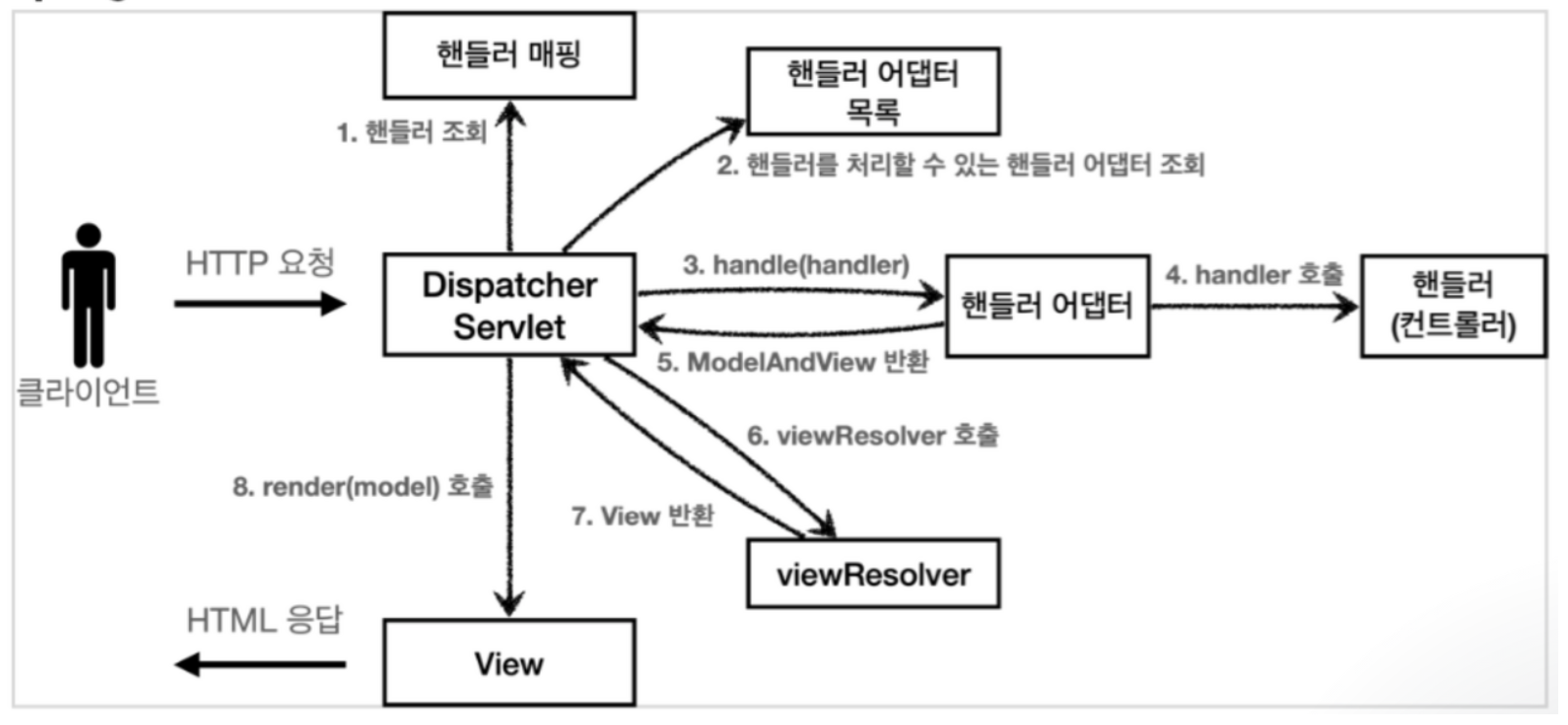 HTTP 요청을 처리하는 프론트 컨트롤러 역할을 맡고 뷰 리졸버 , 핸들러 매핑, 핸들러 어뎁터 등 여러 웹 MVC 구성요소와 상호작용한다.